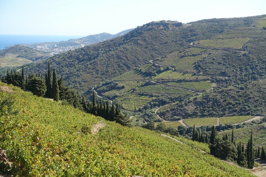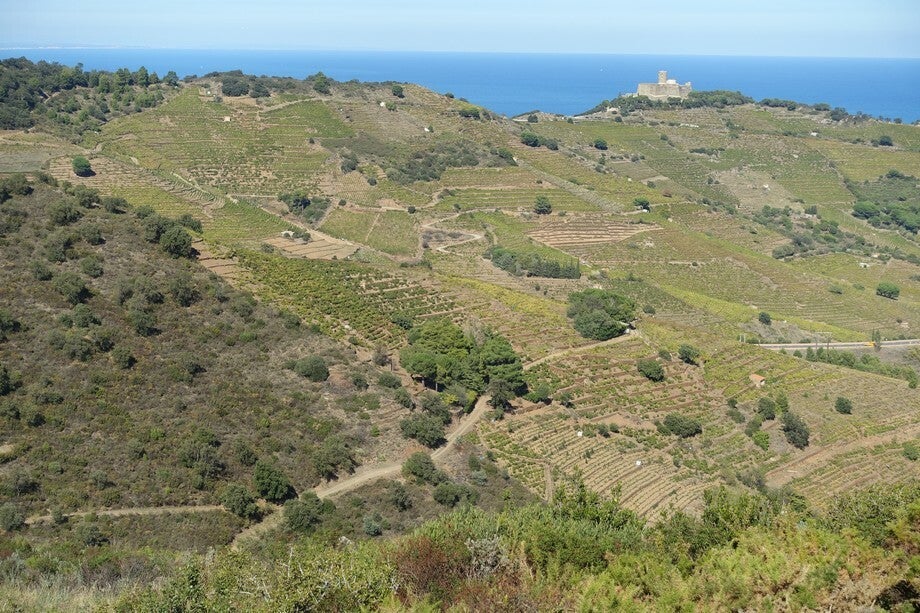 Net voor Collioure ging de route rechtsaf direct omhoog langs de druivenvelden. Al slingerend kwamen we steeds hoger en werden de uitzichten steeds mooier. De turbostand kwam wel goed van pas.