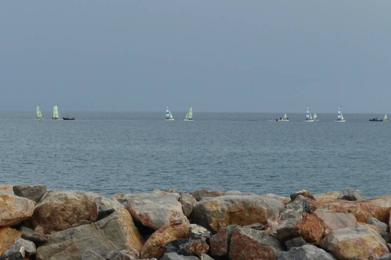 Het strand was leeg maar er werd wel gezeild. Allemaal dezelfde bootjes dus dat was vast de zeilschool.