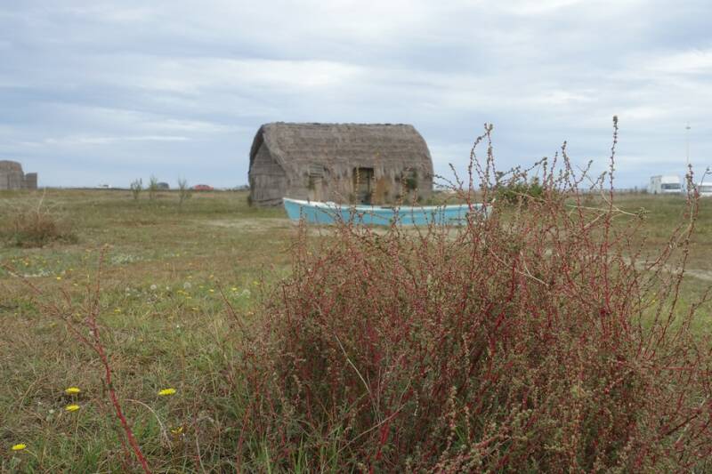 Een paar kilometer voorbij St. Cyprien ligt een binnenmeer waar wel eens flamingo’s te zien zijn. Helaas lieten ze vandaag verstek gaan. Hier staan een paar replica’s van oude vissershutjes in een mooi wandelgebied.