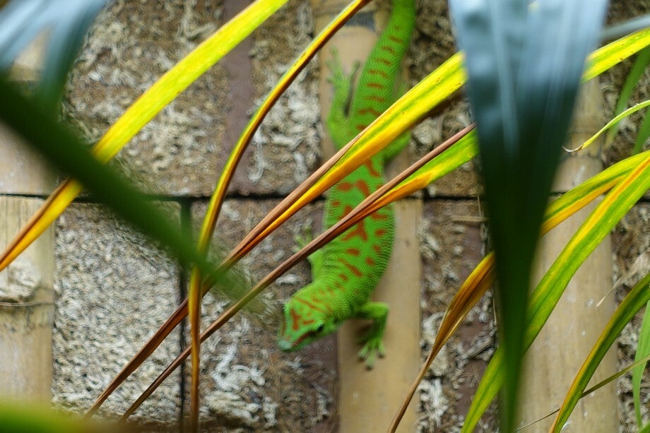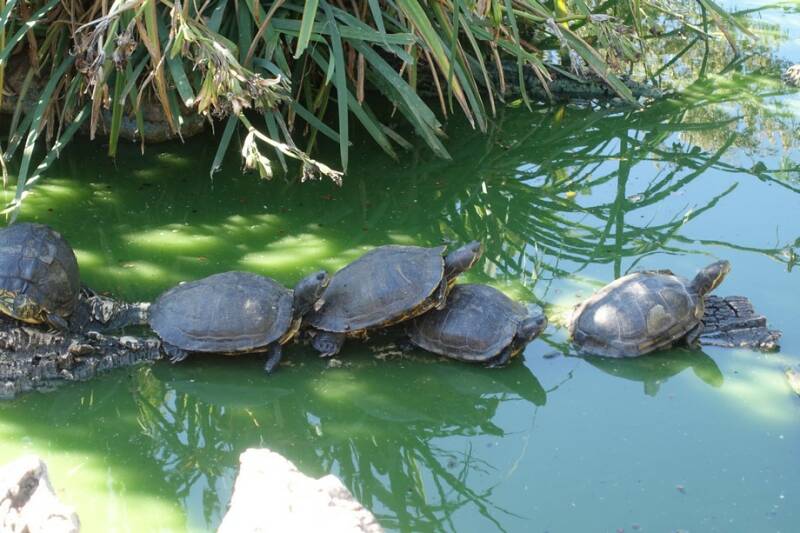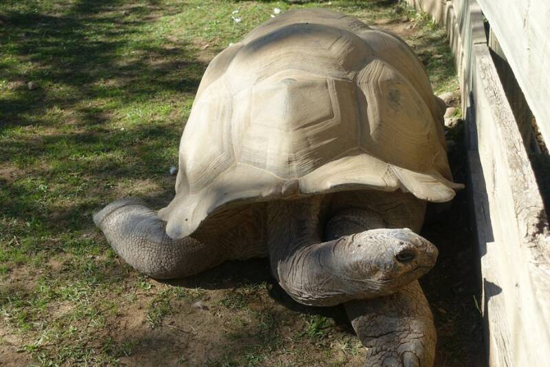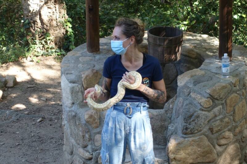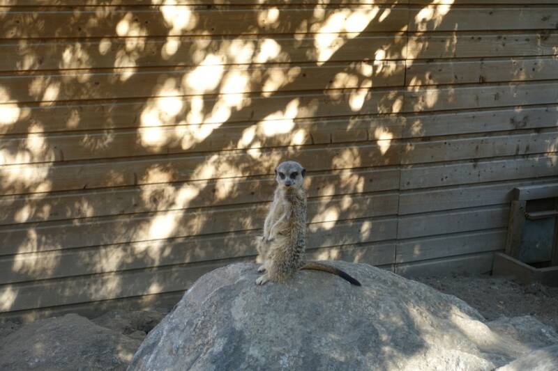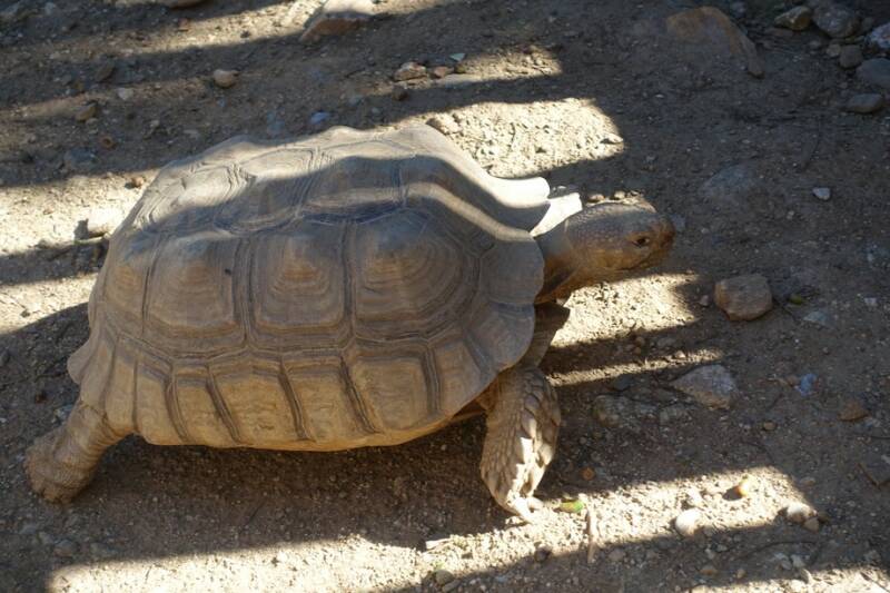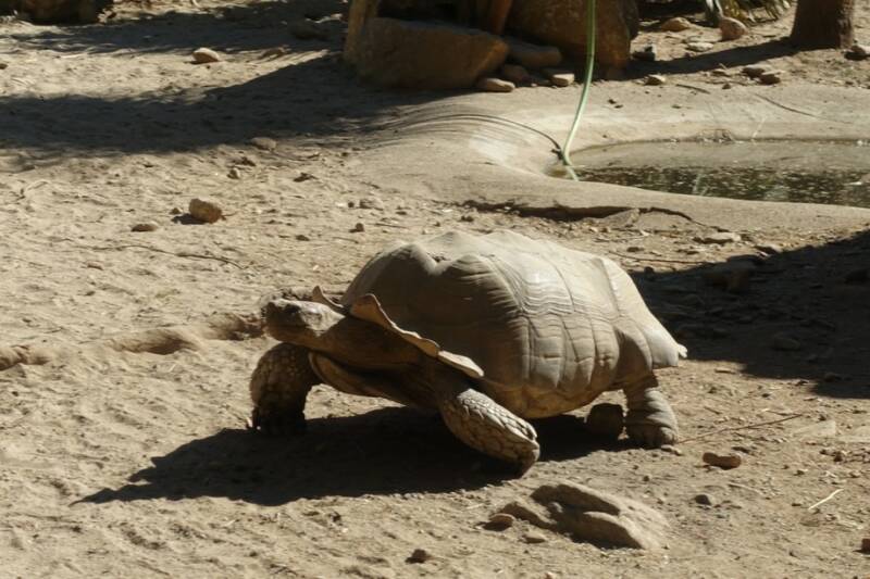 Onderweg was nog een bloeiende bougainville. Terug bij de fiets hebben we ons broodje opgegeten en zijn we een stukje terug gefietst naar Sorede. Hier is La Vallee de Tortues, een kleine dierentuin met voornamelijk schildpadden. Ze kwamen uit verschillende werelddelen, verschillende soorten en maten zijn aanwezig. De grootste waren wel een meter lang. Ook waren er nog wat leguanen en gekko’s, gelukkig wel achter glas. Verder nog een paar slangen waarvan er één uitgebreid werd getoond en mocht worden geaaid door de kinderen. Bij de ingang zijn de stokstaartjes, erg leuk om te zien.