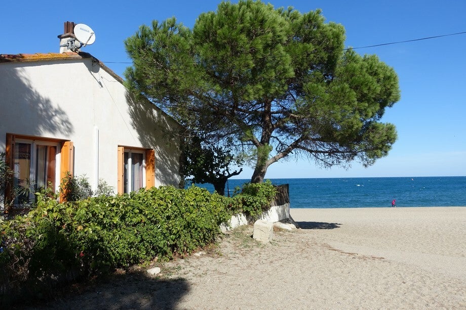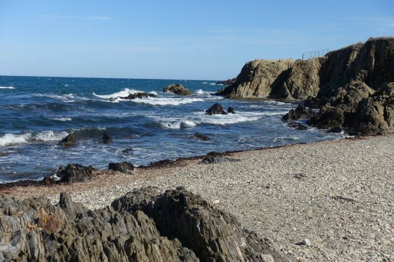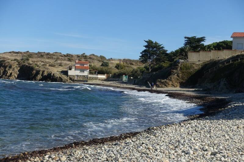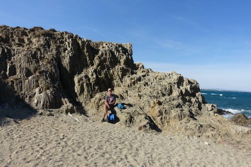 Net voorbij de haven ligt het dorpje Le Racou waar de huisjes aan het strand staan. Hier loopt een weggetje naar boven op de rotsen. Na een loopje boven het water zijn er nog een paar kleine kiezelstrandjes. Daar hebben we nog een poosje in de zon gezeten, lekker in de luwte.