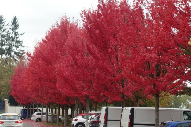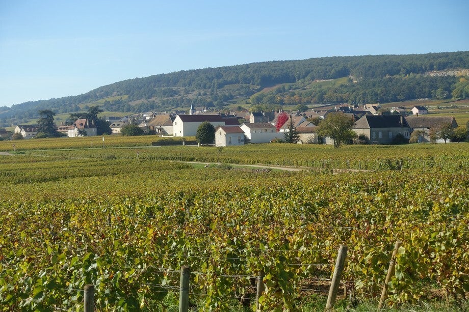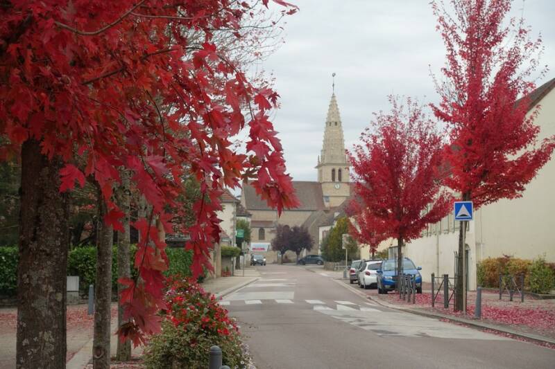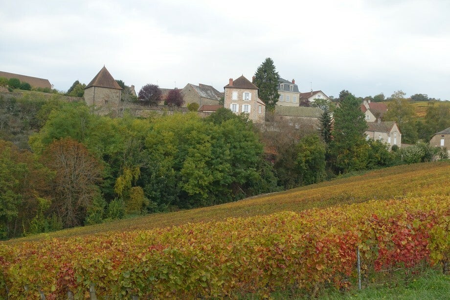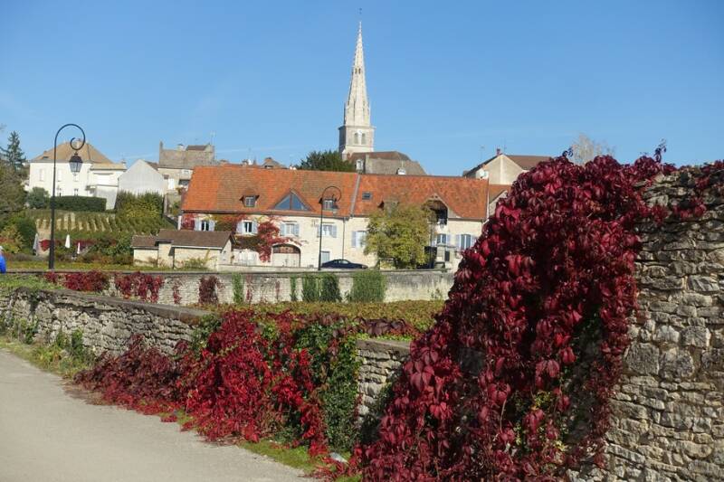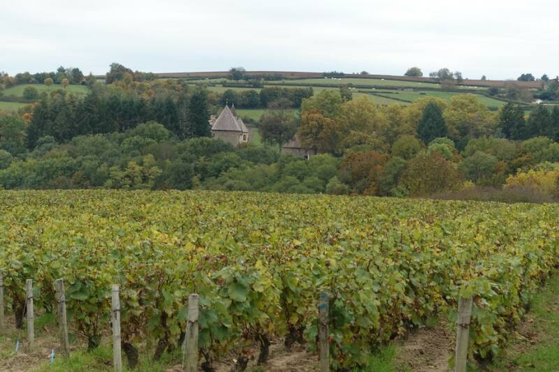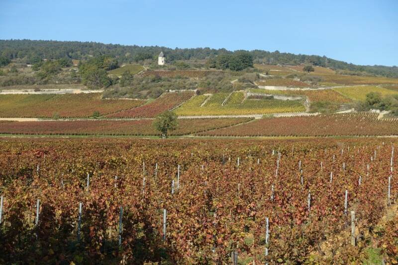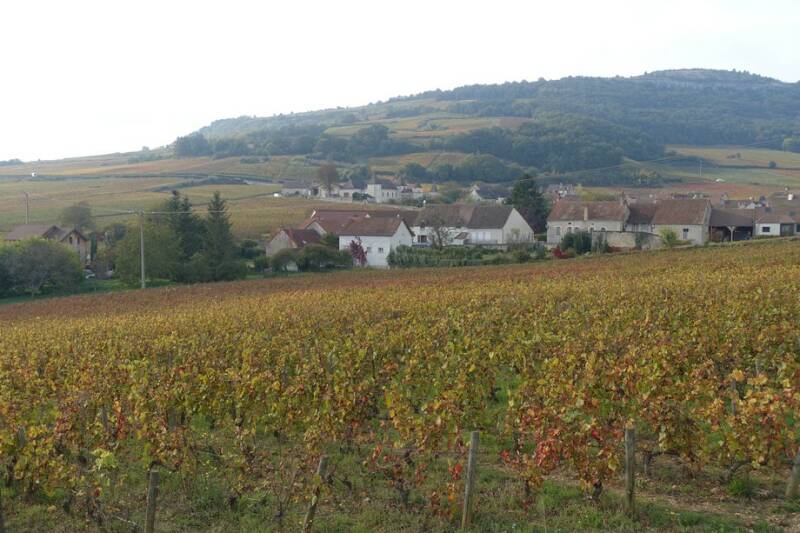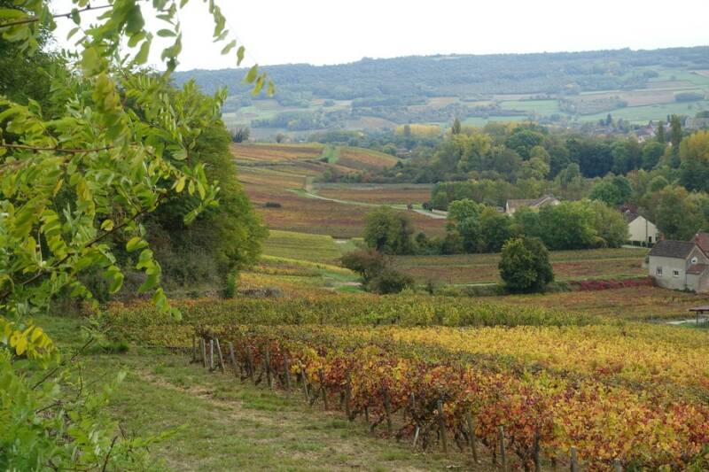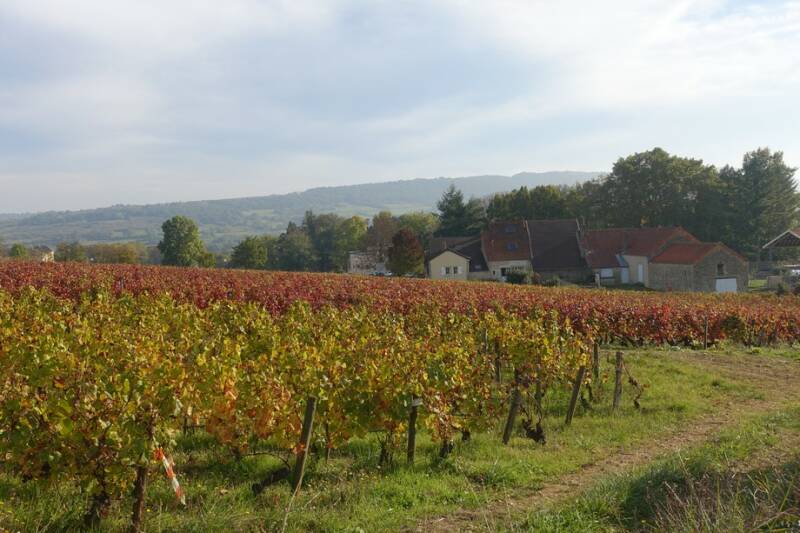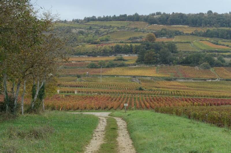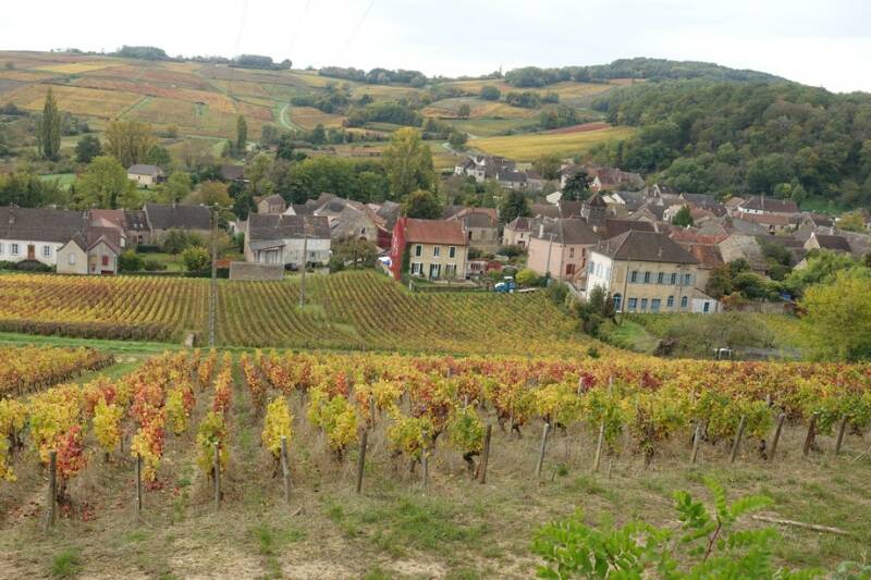 Eerst 10 km langs het kanaal naar St. Legere. Daar is het duidelijk herfst met die mooie rode bomen. Vervolgens 6 km langs een D-weg tot net voorbij het chateau van Couches. Daarna rechtsaf over de D1 richting Nolay. Hier gingen we heuvel op, heuvel af langs dorpjes en druivenvelden. Waar je ook keek, overal mooie gekleurde druivenvelden. Achter een kerkje in een bushokje hebben we ons broodje gegeten. Was wel lekker luw en er kwam geen bus. In Nolay hebben we koffie gedronken, kon Cor zijn koude handen even opwarmen en even uitrusten. Hier hebben we de voie verte weer opgepikt, die wisten we nog van vorig jaar, terug naar Santenay. Vanaf dit pad konden we de overkant van het dal zien waar we heen langs gefietst waren. Ook hier veel druiven en dorpjes.