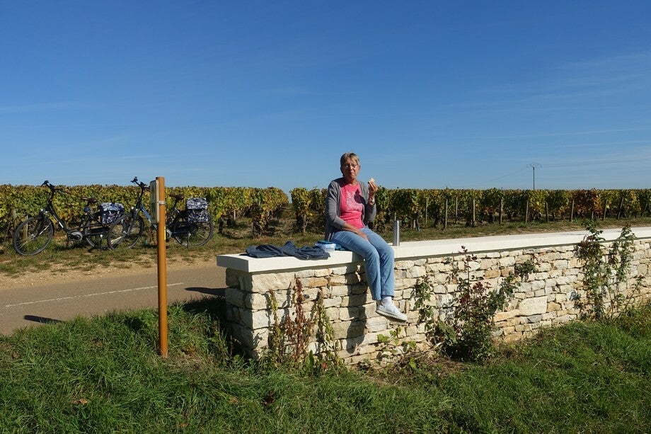 Lekker een eind gefietst langs de route du vin en door kleine dorpjes. Ons broodje hebben we gedaan op een muurtje in de zon te midden van de druivenstruiken. Bij de Mairie van Meursault zijn we weer teruggegaan. Halverwege zijn we afgeslagen naar Chagny waar we vorig jaar naar de Lidl zijn geweest. We wilden nog een paar pakken wijn meenemen voor de voorraad. In het stadje vonden we de fietsroute weer en zijn we over de voie verte langs het kanaal terug gegaan naar de camping.
