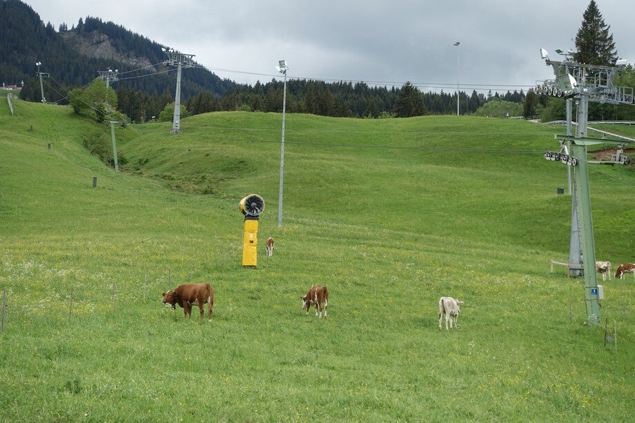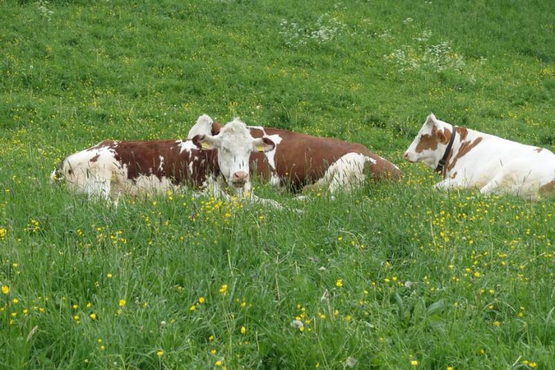 Onder de skipiste langs, waar nu dus de koeien lopen, dan achter een hotel langs, boven de cp langs, dan naar beneden naar het dorp en over de weg weer terug. Het is hier erg mooi vinden wij! Als je in de camper zit kun je de koebellen horen.