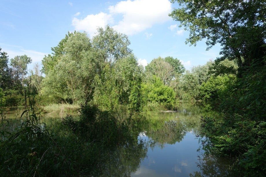 De rivier staat hoog, de bomen aan de kant staan in het water en ook het natuurgebiedje naast de cp staat helemaal onder water.