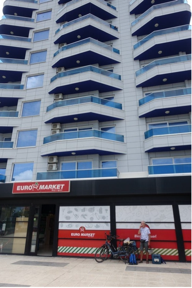 In Pogradec, voor de rijkere Albanezen een geliefde badplaats, vonden we een supermarkt onder een lelijk flatgebouw. Hier konden we pinnen!
