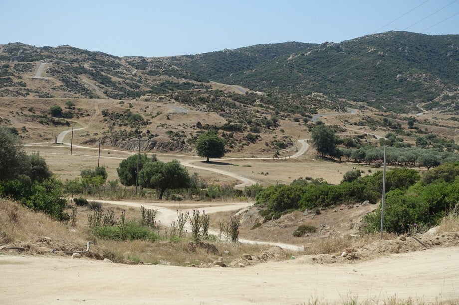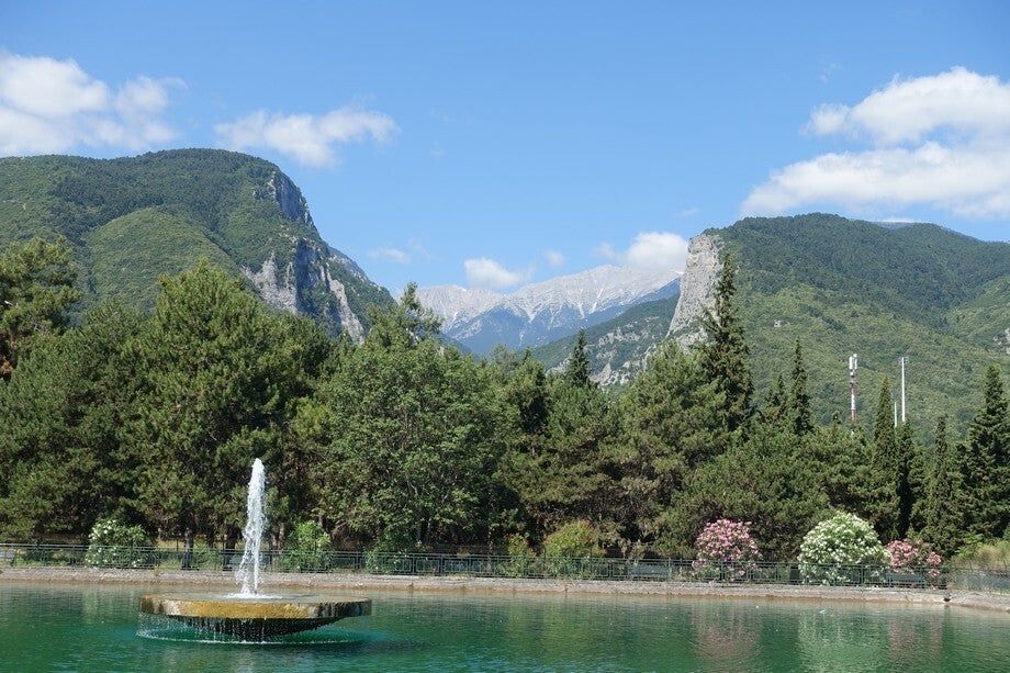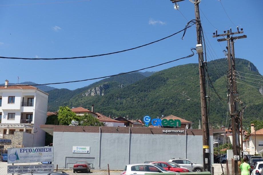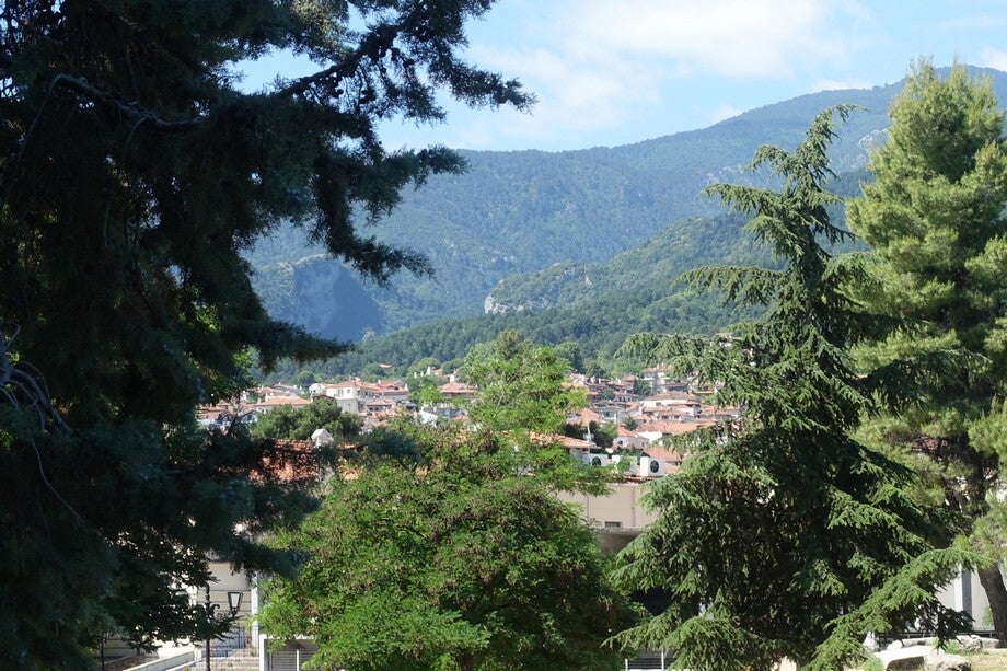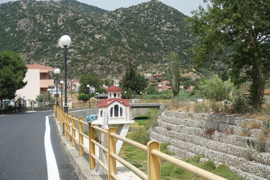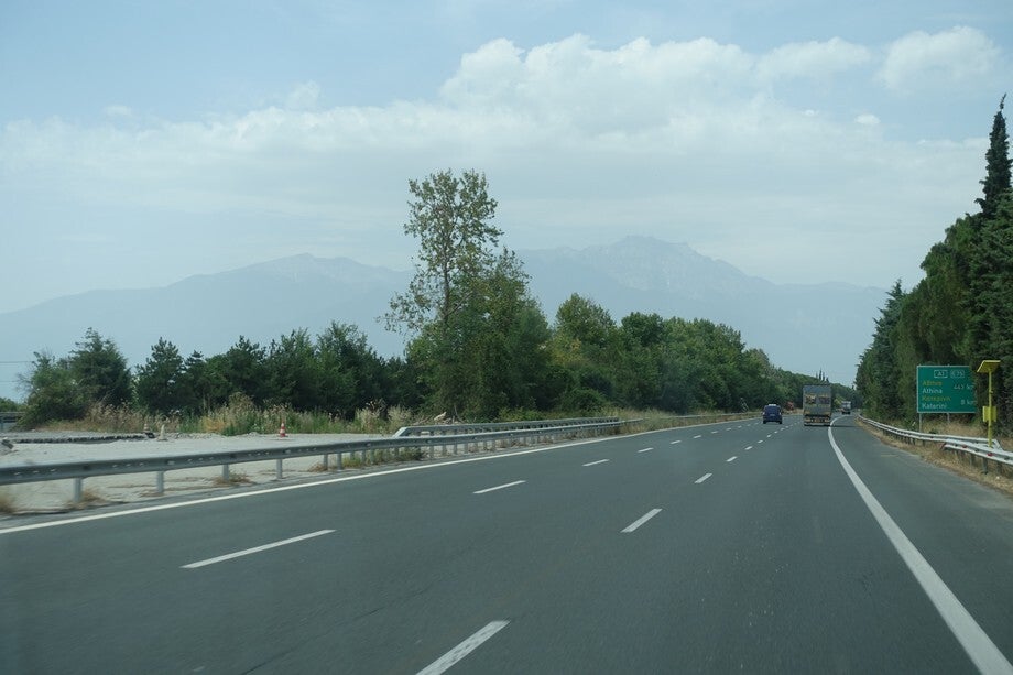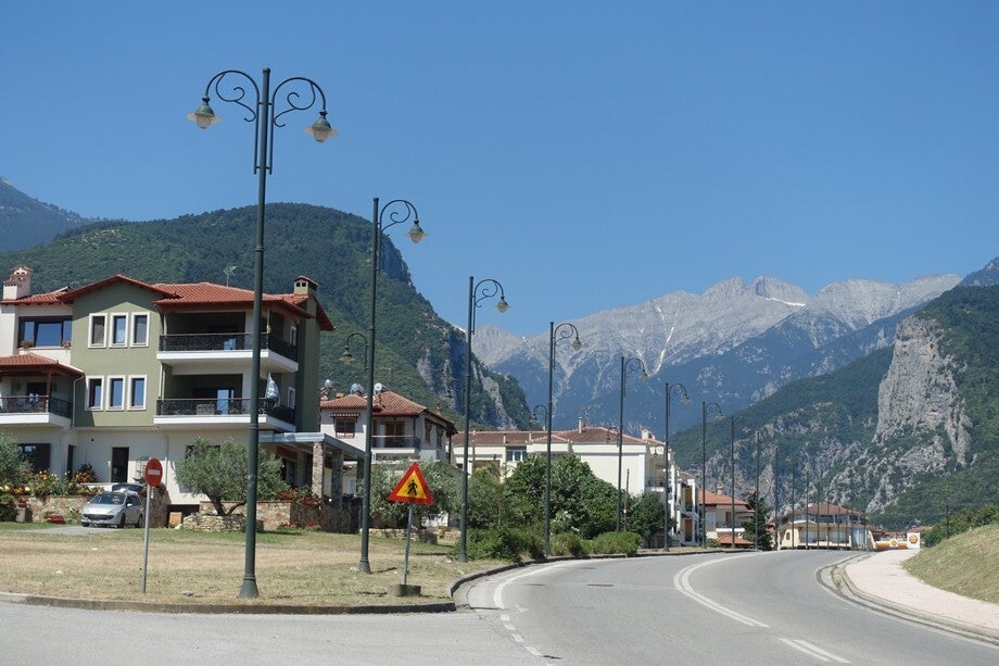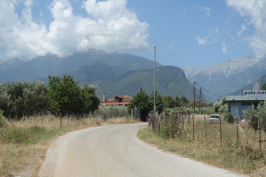 Even over negen zaten we al op de fiets na de tanken te hebben geleegd. Het was nog heerlijk koel dachten we. Na twee stukjes omhoog met de zon op de rug werd het al flink warm. Met twee tussenstops kwamen we in het stadje Litohoro onderaan de berg Olympus.