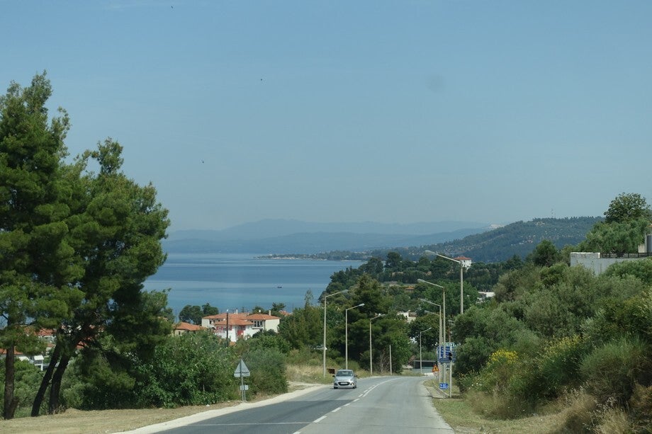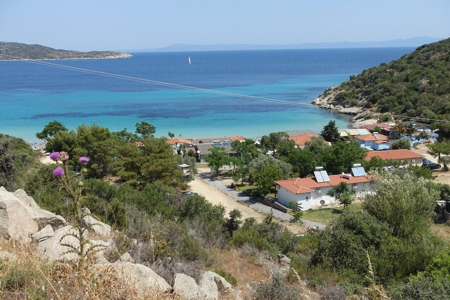 Gisteren zijn we hierheen gekomen na een mooie rit over de rondweg van Sithonia. De oost- en zuidkant daarvan zijn heel mooi. Groen, heuvelachtig en veel blauwe baaien. ’s Morgens vroeg was het nog wat bewolkt maar later werd het steeds blauwer. Boven een stadje aan de westkant was een plekje voor een bakje koffie en een half uurtje later was er een Lidl voor de boodschappen. Daar stond zowaar pindakaas in de schappen en er waren ook stroopwafels te koop. Hollandser kan niet!