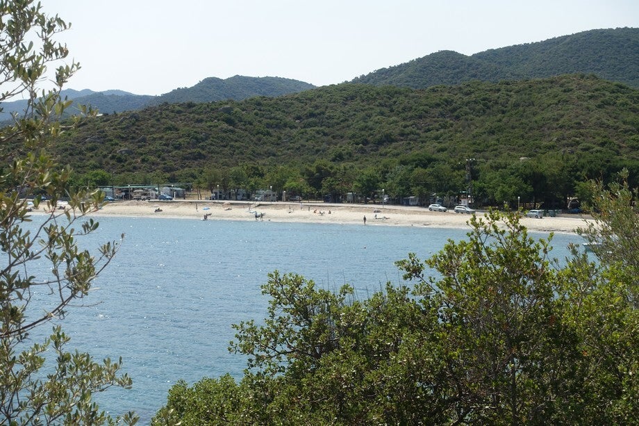 Om iets meer van Sithonia te zien zijn we gisteren verhuisd naar een camping 40 kilometer naar het zuiden, camping Melissa vlakbij het strand van een baai met prachtig blauw water.