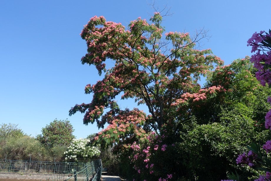 Vanuit het tegenoverliggende park kon je de bovenstad zien liggen en ook de berg natuurlijk. Ook hier bloeien veel oleanders en bomen met een soort oranje pluimen.