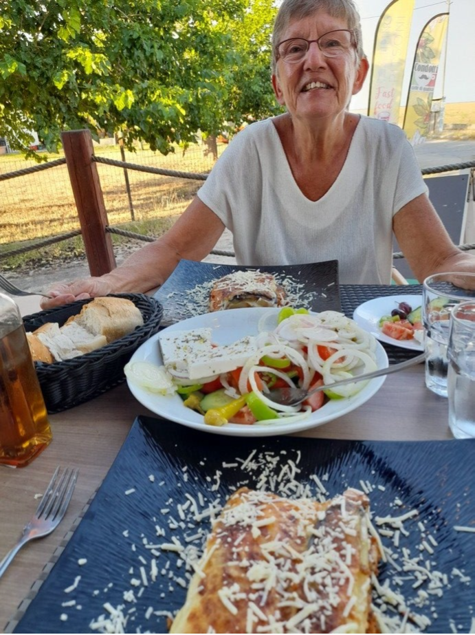 De plaatsen zijn krap en het is vol. Het sanitair is wel heel mooi en de ligbedjes zijn gratis dat is fijn. De gyros was ook erg lekker, maar morgen gaan we toch maar verder.