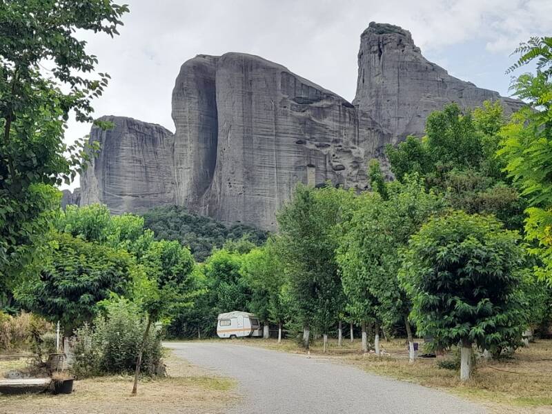 We staan nu op camping Vagros onder aan de kloosters. Bij het zwembad kun je er één zien liggen. Het is een beetje rommelige camping maar het sanitair is goed en we hebben een mooi schaduwplekje gevonden.