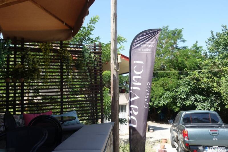 Er was ook een koffiehuis. Tijd voor een bakje! De Grieken weten er wel raad mee, overal kun je koffie krijgen. Op de wimpel stond heel toepasselijk: all you need is coffee.