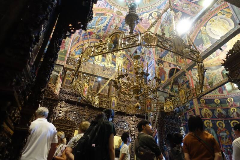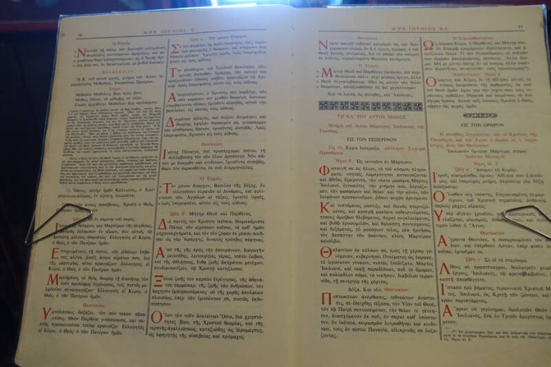 Het lukte om in de kerk een foto van een grote kroonluchter te maken, de doorsnede was wel drie meter, en natuurlijk een bijbel in het Grieks.
