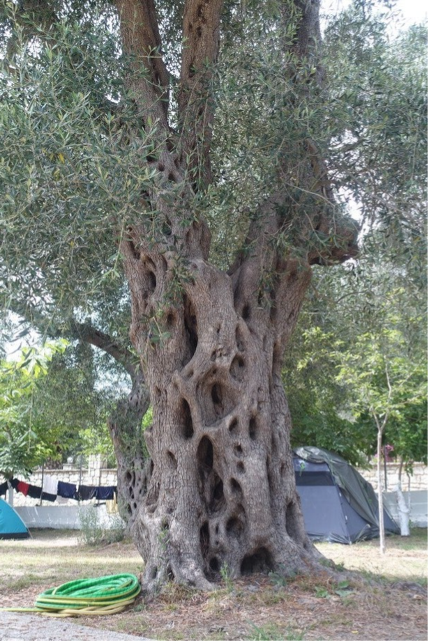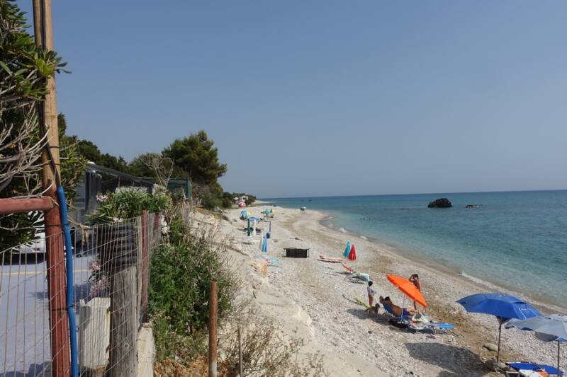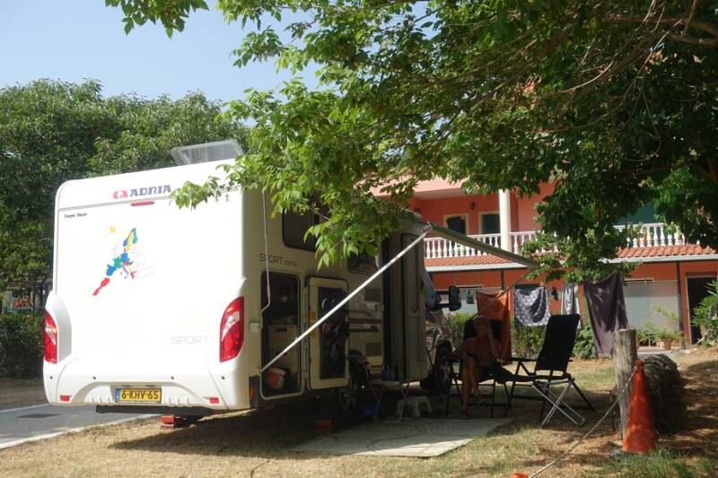 Er zijn veel bomen op de camping, ook heel oude olijfbomen. Onze plaats is goed met genoeg schaduw. Naar het strand aan de groene baai is 200 meter lopen. Het strand is wel druk met heel veel ligbedjes. Er zijn veel hotels en appartementen maar op de camping is het rustig, ook ’s avonds en ’s nachts.