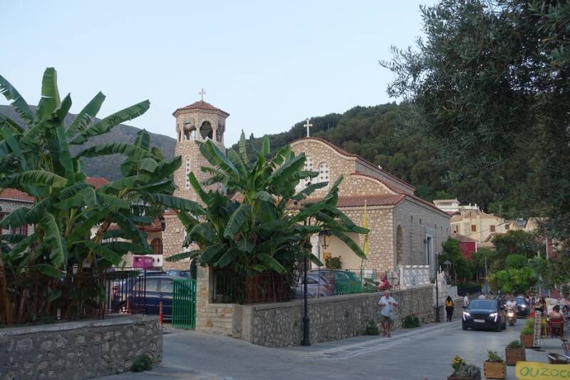 Vanmorgen hebben we een stukje gefietst. Niet heel ver, een kilometer of 5 hiervandaan, want de weg gaat steeds op en neer. Er liggen allemaal strandjes en baaien. Langs de weg zijn veel appartementen te huur en tavernes met ligbedden op het strand. Bij het dorpje Lichia, een paar huizen, wat appartementen, een kerk, een supermarktje was een bakker waar je ook koffie kunt kopen. Dat werd dus koffie met uitzicht! De kleine supermarktjes die je tegenkomt vinden we wel erg duur. Onderweg maar weer naar de Lidl.