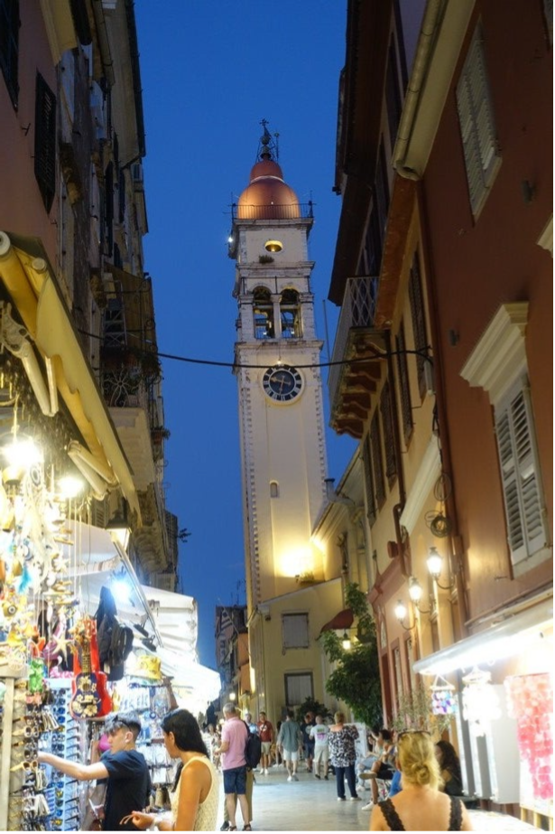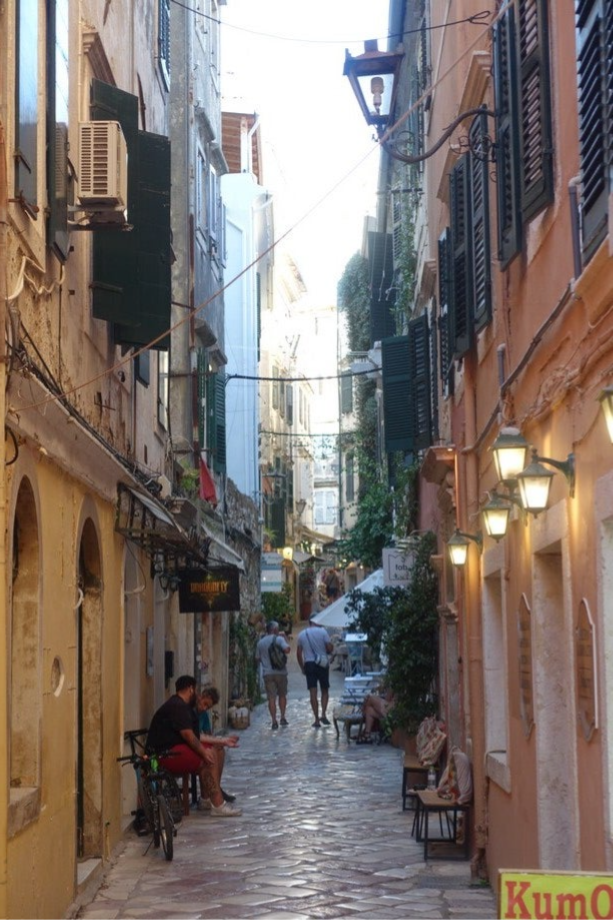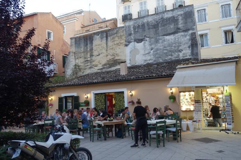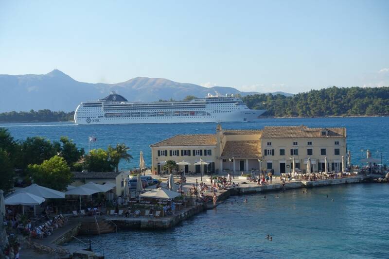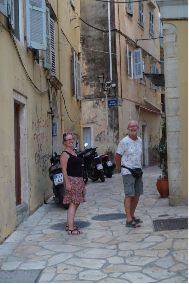 ’s Avonds zijn we op een terras aan het water gaan eten met zicht op de bergen van Albanië aan de overkant. Met zonsondergang kleuren ze mooi roze en aan de andere kant kunnen we Corfustad zien liggen, daar gaan we morgen nog even kijken.