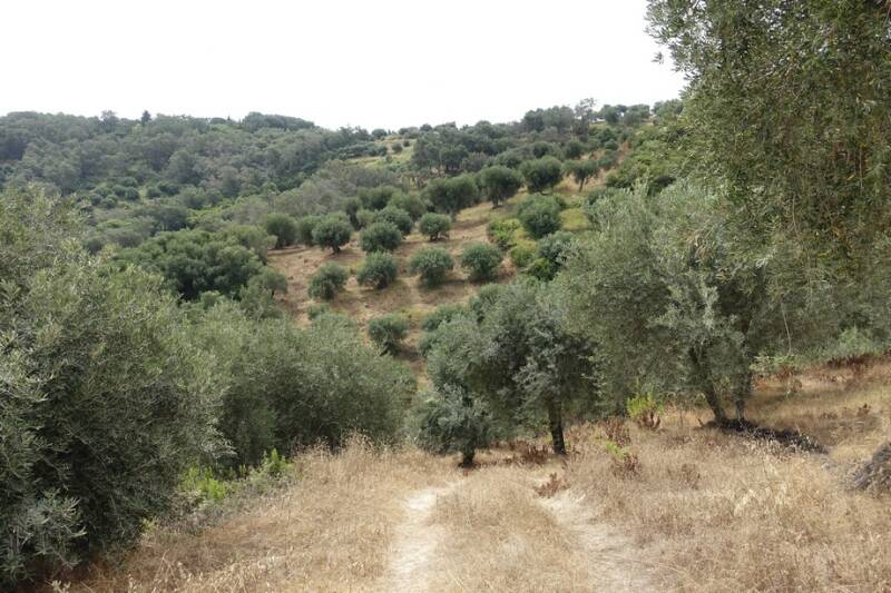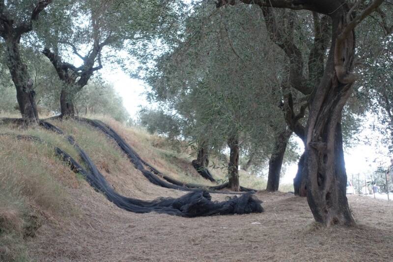 Zoals op het hele eiland zijn hier ook veel olijfbomen en de oogstnetten blijven hier gewoon liggen.