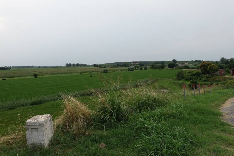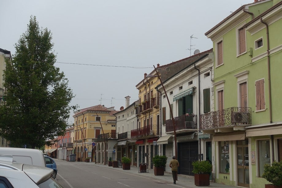 Aan het eind van het dorp zagen we een dijk en we dachten dat de Po daar achter zou zijn, daar ligt echter een groene polder, de Po is nog een stukje verderop. Vanaf de dijk kijk je wel mooi op het dorp.
