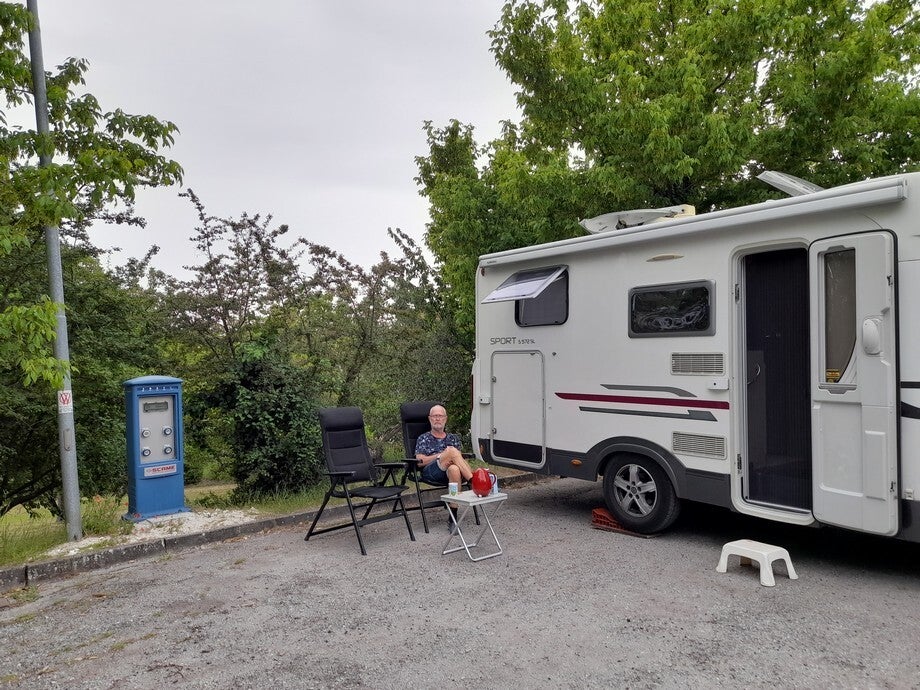 Er zijn acht plaatsen maar vijf daarvan werden bezet door gewone auto’s. Er is een volleybaltoernooi op het sportpark hierachter en het is druk. Er was nog net één plaatsje voor ons.