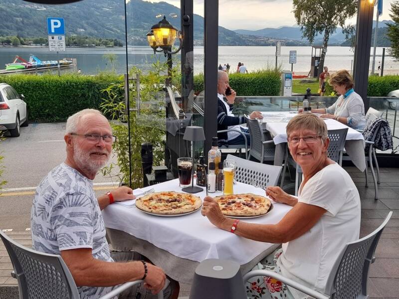 ’s Avonds hebben we pizza gegeten op een terras aan de overkant pal aan het meer.