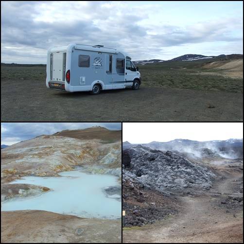 Eerst nog een rondje om het meer gereden en toen naar het zwembad. Daar hebben we anderhalf uur in gezeten. Daarna zijn we naar boven gereden en staan nu bij de Krafla. Na het eten nog een rondje gelopen over de Krafla. In het begin moesten we dit overslaan om dat het te mistig was.