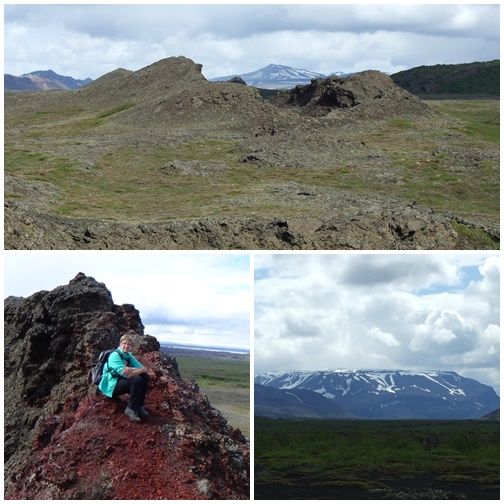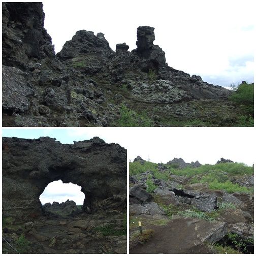 We zijn vrijdagmorgen gaan wandelen bij Dimmuborgir. Eerst door een oud begroeid lavaveld en toen door een zwarte stenenwoestijn. Het was mooi weer en daardoor waren er ontzettend veel vliegjes dat waren we even vergeten maar we zijn toch doorgelopen tot we bij een krater kwamen Ludent genaamd. Al me tal hebben we bijna vier uur gelopen.