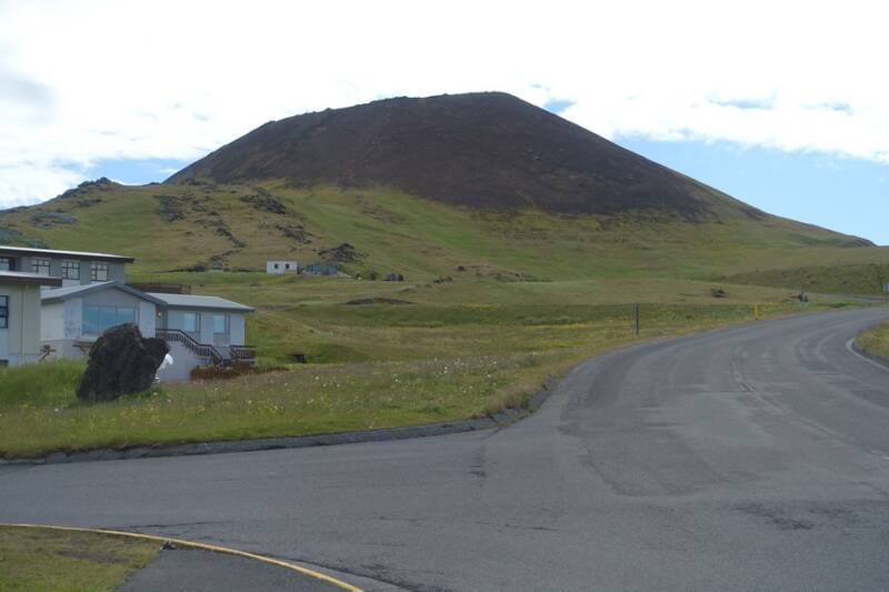 Vervolgens gingen we naar de nieuwe vulkaan, de Eldfell. Er loopt een weggetje tot in de krater. Hier kregen we uitleg over de uitbarsting in 1973 en er waren mooie gekleurde lavabrokken te zien.