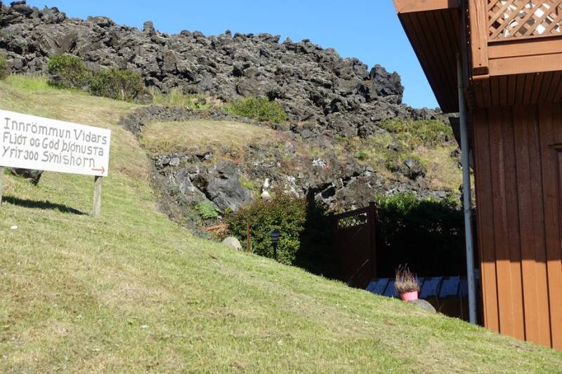 In het lavaveld staan bordjes met straatnamen en namen van huizen die onder een lavalaag van 16 meter dik bedolven zijn.