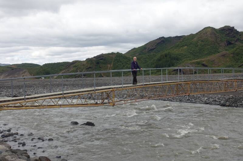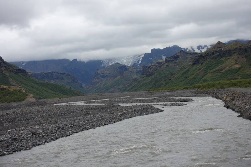 De busrit naar de Þörsmork is al mooi. Onderweg kom je langs een gletsjertong, daar stopt de bus ook even. Net voor de hut en camping in het Langidallur moet er nog een rivierbedding overgestoken worden met een brede waterstroom en een aantal kleinere stromen, zonder brug natuurlijk. Dan heb je er al een aantal gehad ook. Het is een 4x4 bus dus die komt overal doorheen. Soms is er een trekker met schuiver voor nodig om de “weg”weer vrij te maken. Door de sterke stroming verandert de rivierbedding voortdurend. Voordat je er bent, ben je al flink door elkaar geschud maar het blijft een mooie rit.