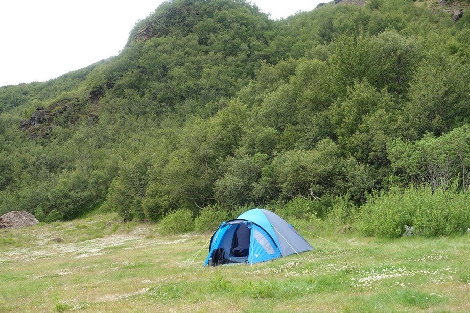 Om twaalf uur stond de tent met mooi uitzicht op een gletsjer aan de overkant. Vorige keer was de sneeuw nog zwart van de as na een vulkaanuitbarsting.