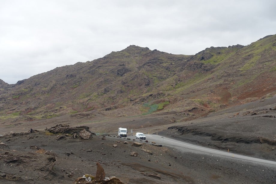 De weg gaat regelmatig door oude, met mos begroeide lavavelden. Voorbij Grindavik kregen we een stukje gravel dwars door de lava.