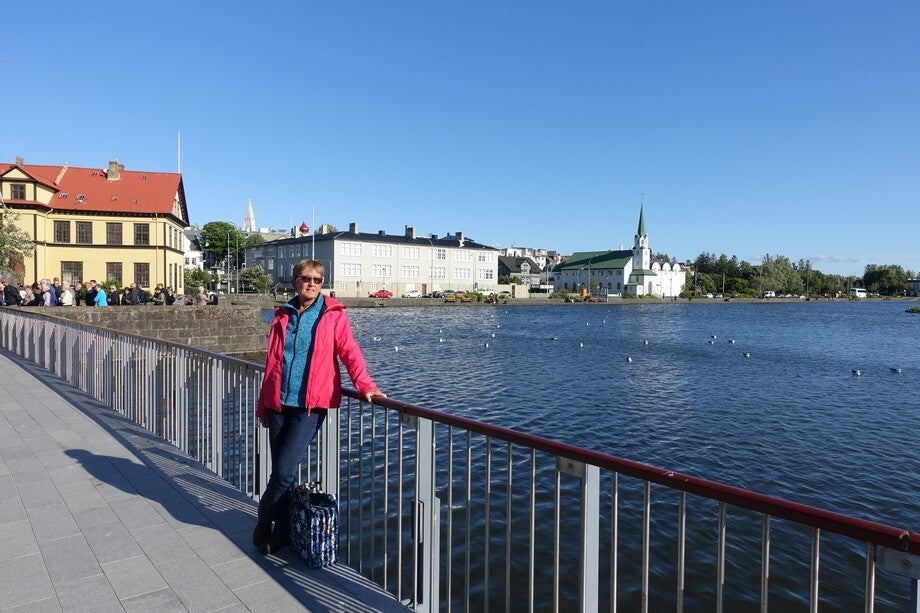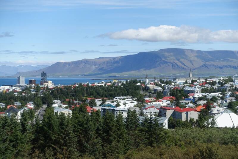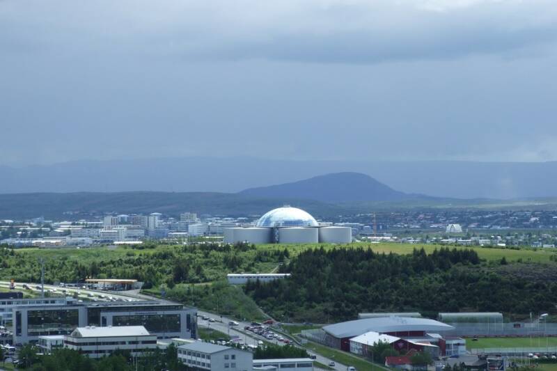 Na de koffie met stroopwafel uit Nederland, zijn we op de fiets gestapt. Eerst naar het Perlan. Dit gebouw bestaat uit zes hele grote watertanks met een restaurant erop in bolvorm. Het geheel draait langzaam rond en op het panoramaterras heb je mooi uitzicht over de stad en omgeving.