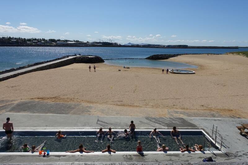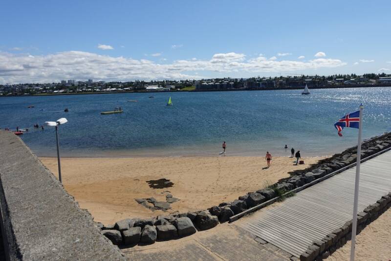 Als je door het bos naar beneden fietst kom je bij een baai met een strandje, Nautholsvik. Hier is ook een heel lekker warm badje. Als je te warm wordt kun je over het strand naar de baai lopen en daar afkoelen. Ook daar zijn warme stromen vanuit het ronde bad op het strand. Heel bijzonder! In de baai zelf was ons te koud maar er zijn best veel mensen die dat wel doen. Er werd ook gekanood en gesurfd. Ondanks dat het badje nog steeds gratis is, is het er nooit heel druk. Dat is ons al vaker opgevallen.