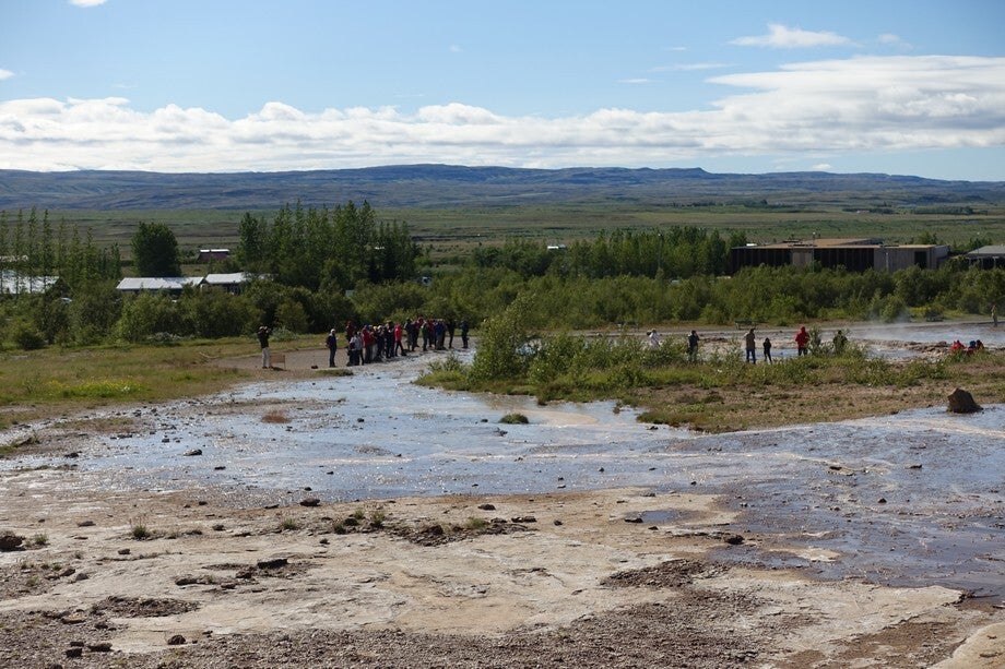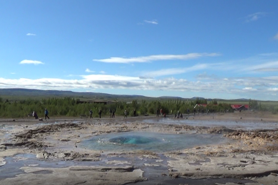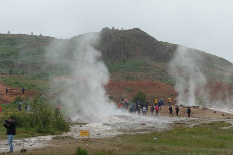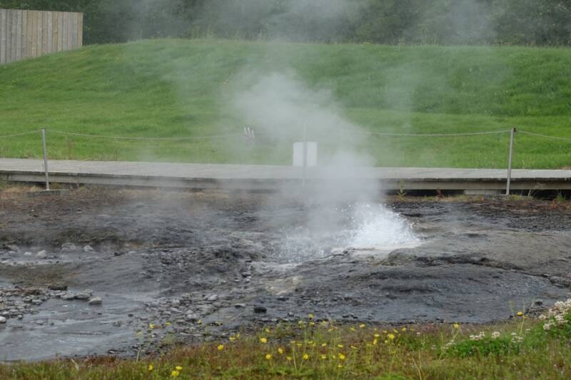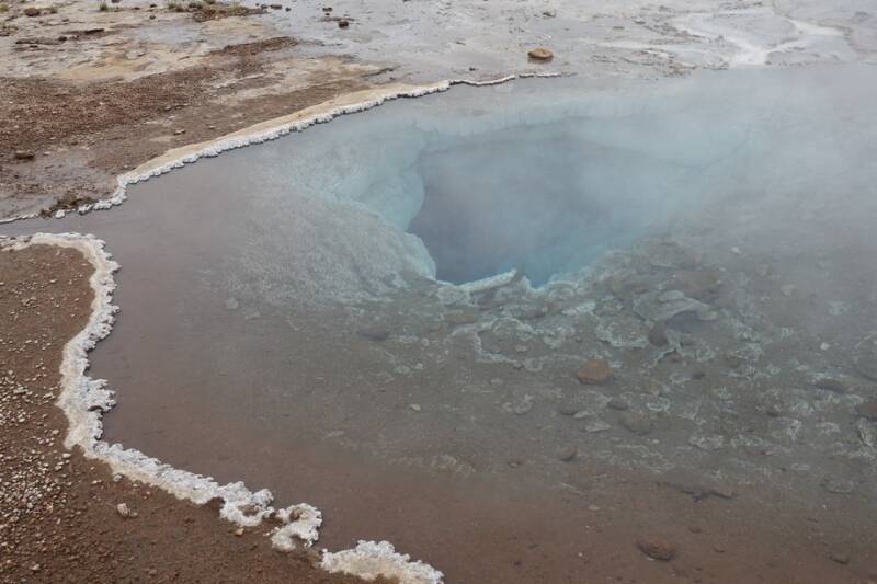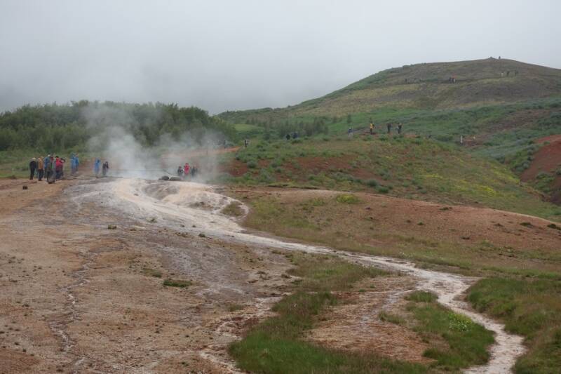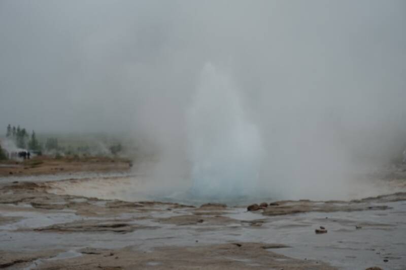 Hierna zijn we het dal ingereden richting Geysir. Het regende nog steeds en dat is jammer want het is een mooi groen dal met een paar kraters en mooie bergruggen maar daar was nu weinig van te zien. Bij Geysir aangekomen werd het even droog, dus hebben we een rondje gelopen tussen de hete bronnen en stoompotten. De grote Geysir, de Strokkur, deed het ook nog. In een andere hete poel was het water zo helder dat je het gat kon zien waar het vandaan kwam.