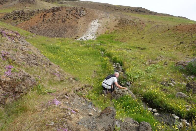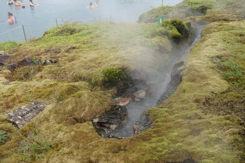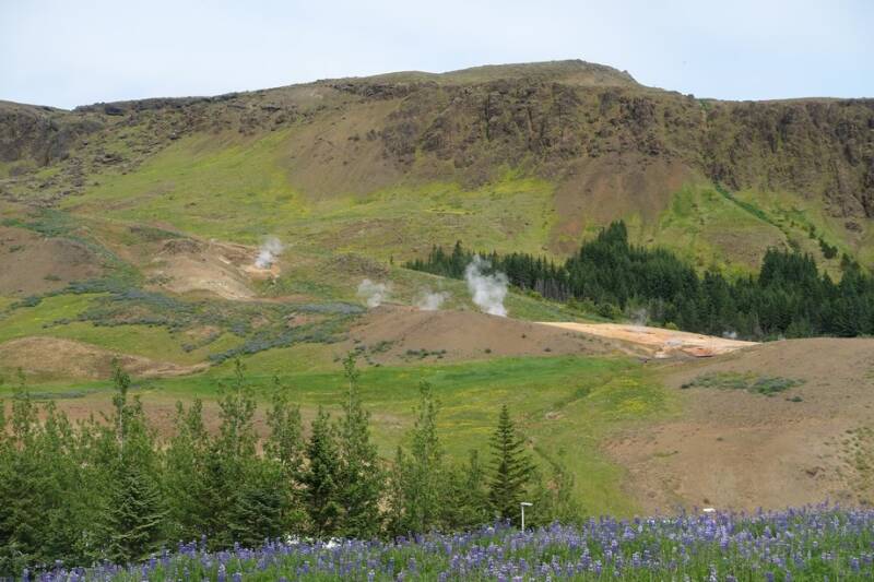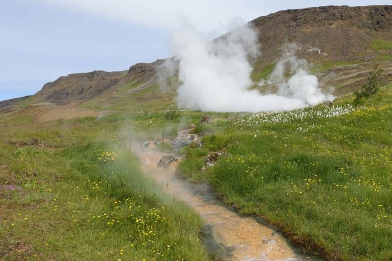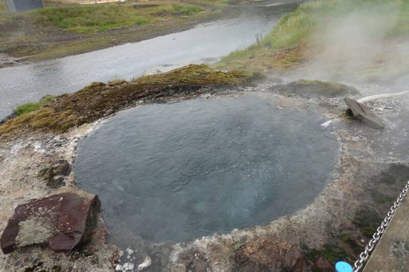 We zijn doorgereden naar de camping in Hveragerði. Dit dorp ligt in een mooi groen dal met veel hete bronnen. Als je achter het dorp het dal in loopt stoomt en pruttelt het overal. We kwamen een mooi beekje tegen maar dat water was lauw. Langs het pad liep een hete buis waar je het water doorheen hoorde stromen. Die buis kwam bij een hete bron vandaan en daar was een heet beekje richting rivier. Dan krijg je dus een hete waterval.