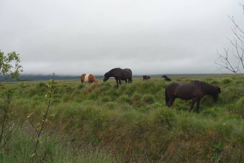 We zijn doorgereden naar een camping van de campingkaart een paar kilometer verderop want die bij Geysir is erg duur geworden. In de verte zijn de stoompluimen van Geysir nog te zien. Achter de camping grazen de paarden.