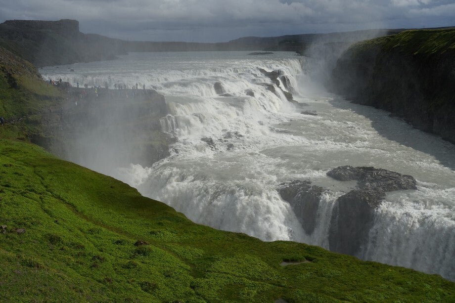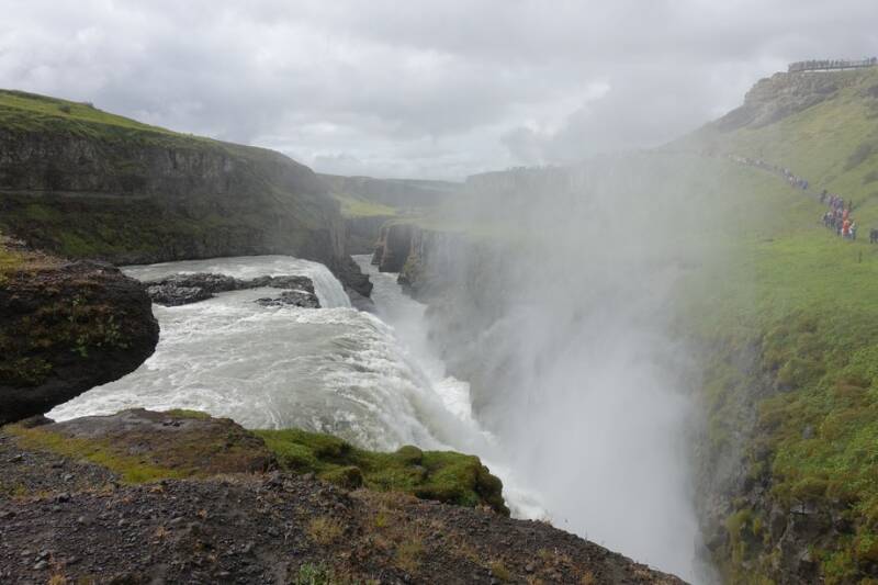 Vijf km verder langs deze weg is de waterval Gullfoss, één van de bekendste. Hij is niet heel hoog maar wel breed en valt in twee trappen naar beneden. Als je er vlakbij staat is het geraas van het water erg indrukwekkend.