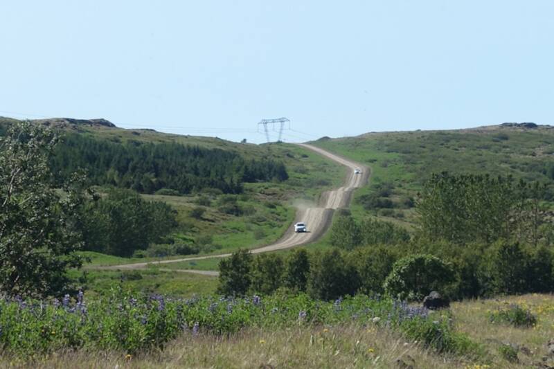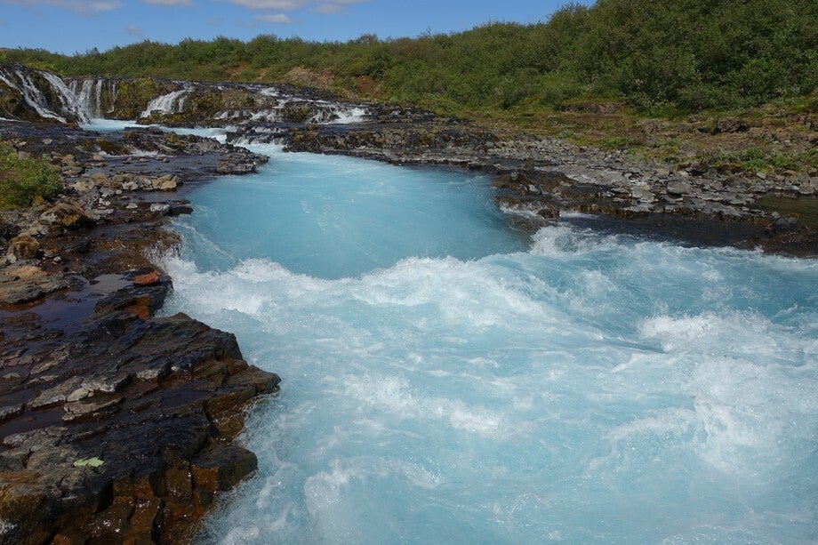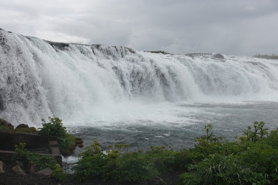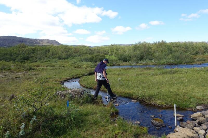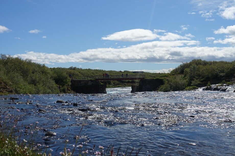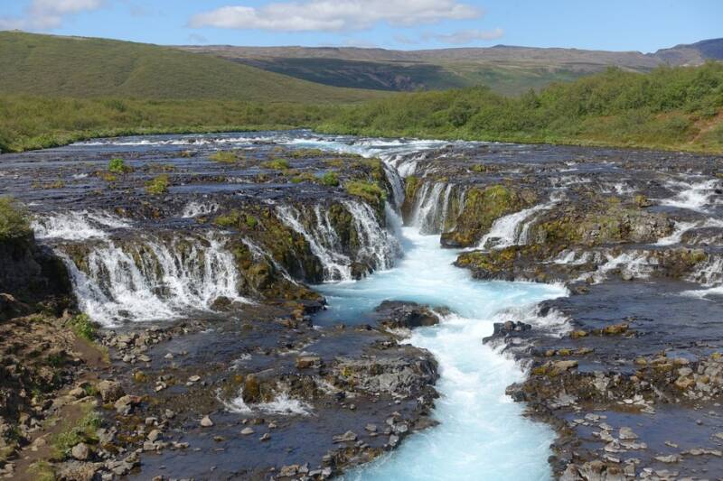 Twaalf jaar geleden hebben we een stukje verder langs dezelfde weg een wandeling gedaan naar de Bruafoss, een mooie waterval waar je alleen te voet kan komen. Volgens de reisgids moet je dan naar een zomerhuisjeskamp via een wasbordweggetje van drie kilometer en dan daarvandaan gaan lopen. De wandeling is twee kilometer door een bosje en over een beekje en dat hebben we ook deze keer gedaan. De waterval is heel apart vanwege de kleur van het kolkende water. Deze keer waren we er niet alleen, er liepen best veel mensen af en aan. Wat bleek, er was een parkeerplaats gemaakt voor de Bruafoss, 5 km verderop en daar vandaan hoef je niet over een wasbordweg maar kun je zo gaan lopen langs de rivier. Dit stond nog niet in de reisgids!