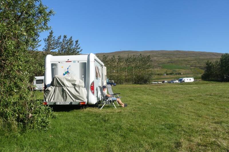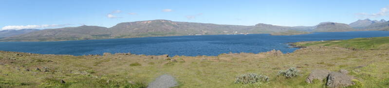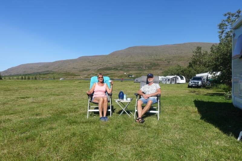 Hierna zijn we via Laugarvatn en Þingvellir naar de Hvalfjord gereden, binnendoor over een nieuwe asfaltweg. Langs de fjord zijn we nog gestopt voor het uitzicht. Wij moesten naar de overkant en dan een heuvel over en daar ligt Þorisstadir, onze camping, aan een meer tussen twee bergruggen. Het is een enorme camping dus plaats genoeg. Als het morgen mooi weer is, net als vandaag, dan blijven we hier maar een dagje. Het is hier erg mooi.