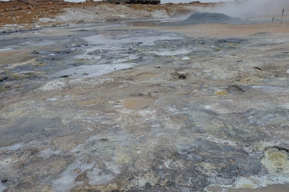 Een paar kilometer voor het Myvatn ligt de berg Namafjall. Deze is mooi gekleurd door de geotermische plekken die op de berg liggen. Het stoomt ook op de berg overal. Onderaan de berg ligt Hverir, een gebied vol met kokende modderpotten en stomende bergjes. Door de zouten, mineralen en zwavel dat mee omhoog komt is de aarde mooi gekleurd. Het stinkt hier behoorlijk maar het is mooi om te zien.