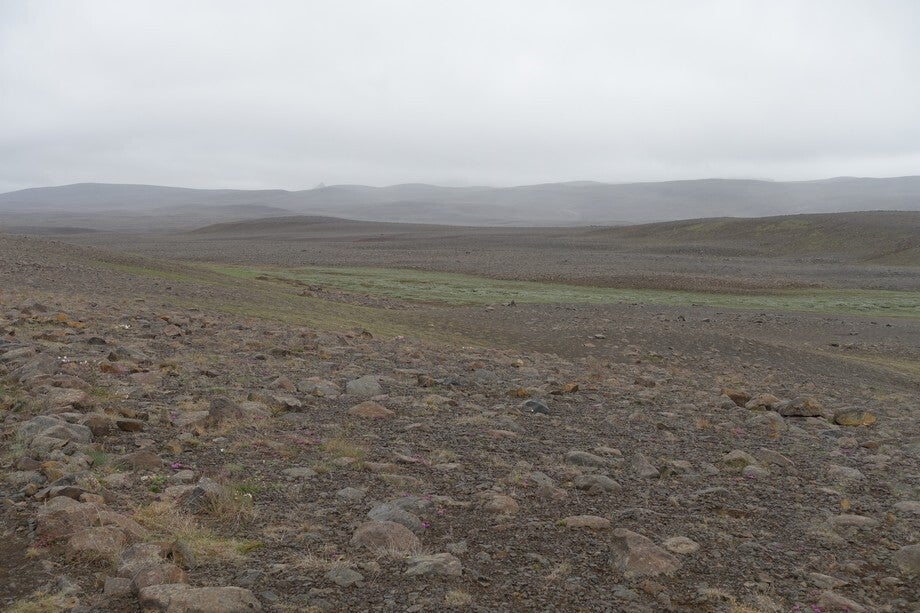 Het Möðrudalur is wel een mooie plek maar als het regenachtig en koud is, is het niet een plaats om te blijven dus zijn we weer richting Myvatn gegaan. Eerst het bijzondere dal uit richting grote weg, de bergen zijn hier zwart.