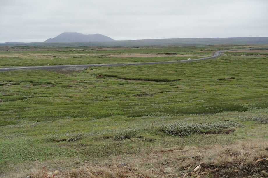 Net voor het dorp Reykjahlið was de afslag naar Grjótagja, een grotje met heel warm water onder het lavaveld. Hier loopt nu een asfaltweg heen, er is een parkeerplaats gekomen en het is hartstikke druk daar. Ooit hebben we er heel rustig alleen overnacht en in het grotje gebaad. Dit mag nu allebei niet meer. Het uitzicht is er nog steeds mooi.