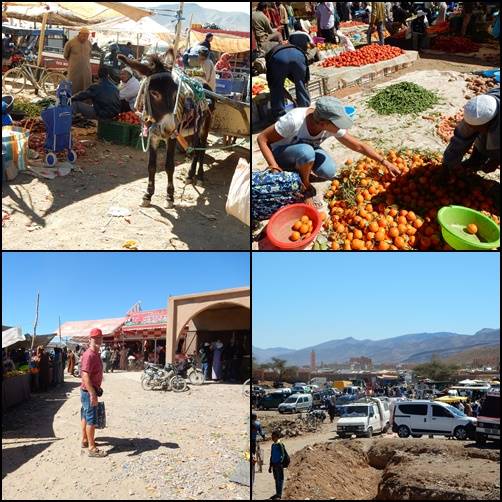 Zoals altijd was de souk een grote gezellige mierenhoop. Alles krioelt door elkaar en iedereen staat met iedereen te praten en te handelen. Vrachtwagentjes rijden af en aan en overal tussendoor maar ook ezelkarren en fietsen en brommers.