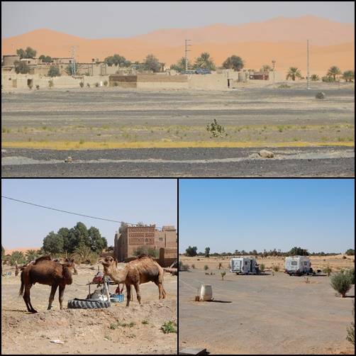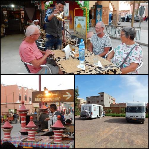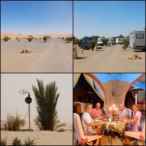 Net voorbij Tamagroute, ten zuiden van Zagora, waren we gestopt voor een broodje. De wind was flink aangetrokken en in de verte was de lucht bruin van het zand. Terwijl we zaten te eten kwam het zand steeds dichterbij. Toen zijn we teruggereden naar Tamagroute waar Gerard en Margot langs de weg stonden. Het begon inmiddels flink te stuiven en na overleg besloten we hier op de camping te gaan. Mahmid is nog 75 km verder en het leek ons niet verstandig om verder te rijden.