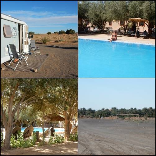 Het is een klein campinkje bij een hotel in een palmentuin. We hadden hier niet veel last van de wind. Alleen zat de camper wel weer vol zand!