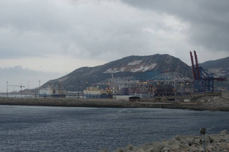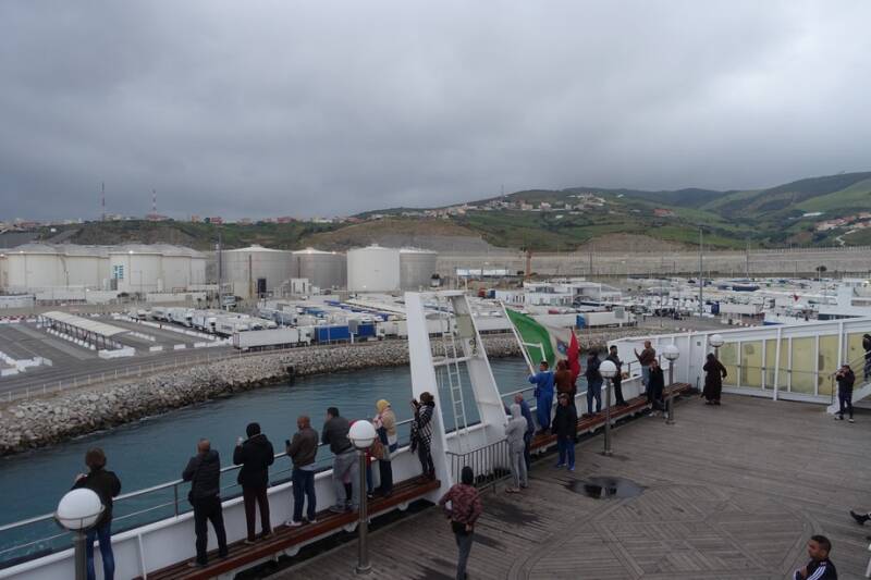 Om zeven uur voer de boot weg en namen we afscheid van een regenachtig Marokko.