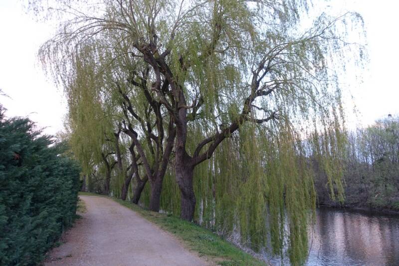 Wit bloeiende bomen, gele struiken, kale bomen, bomen met bollen erin en een mooie treurwilg.