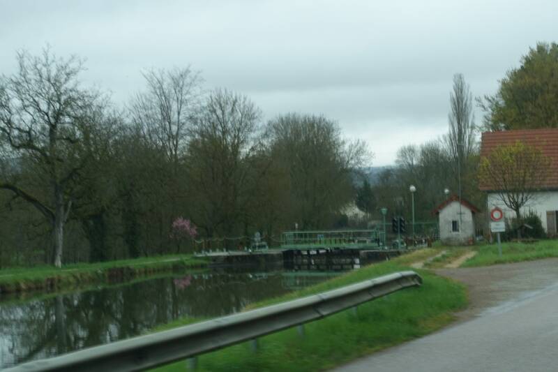 Om negen uur reden we weg van de cp. Geen tolweg gehad vandaag, allemaal goede alternatieven. Eerst allemaal N-wegen, zelfs met parkeerplaatsen. Voor Beaune wilden we een stukje afsnijden over een d-weg, gele weg op de kaart. Het ging niet snel maar was wel een mooie route langs een kronkelend kanaal met heel veel sluisjes erin. We gaan een keer terug om te fietsen maar dan met mooi weer. Vandaag was alleen maar regen. Zo ook over de route de Grande Crus dwars door de Bourgogne richting Dion. Het weer moet nog wel veranderen anders is er geen bourgogne dit jaar, de druiven doen nog niets!