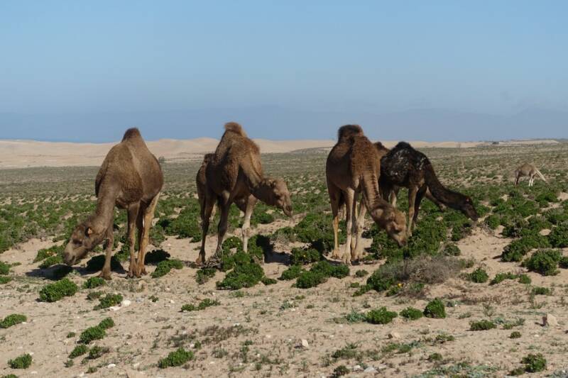 Vlak voor het dorp kwamen we een kudde kamelen tegen in de duinen.